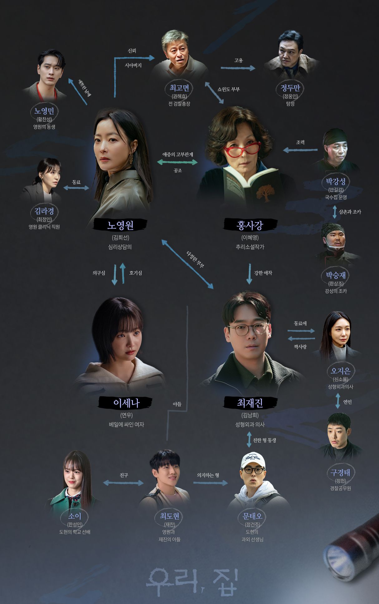 전직 경찰로 한 번 과녁에 들어온 대상은 끝까지 파헤치는 집념이 있다. 고면과는 두 사람이 검찰, 경찰 현직 시절에 있을 때부터 인연을 이어온 사이로, 예리한 관찰력과 동물적인 직감, 집요한 수사력을 인정받아 경찰 은퇴 후에도 고면의 비밀스러운 의뢰들을 처리해왔다. 고면의 의뢰로 세나를 조사하던 두만은 그녀가 겉보기와 달리 위험한 존재라는 걸 본능적으로 직감하게 된다. - 안요섭 cast 양재현
