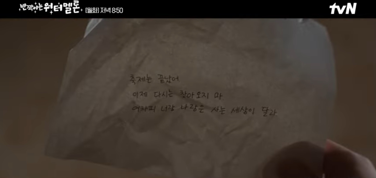 '축제는 끝났어 이제 다시는 찾아오지마 어차피 너랑 나랑은 사는 세상이 달라' 라고 청아가 이찬에게 쪽지로 남긴다.
