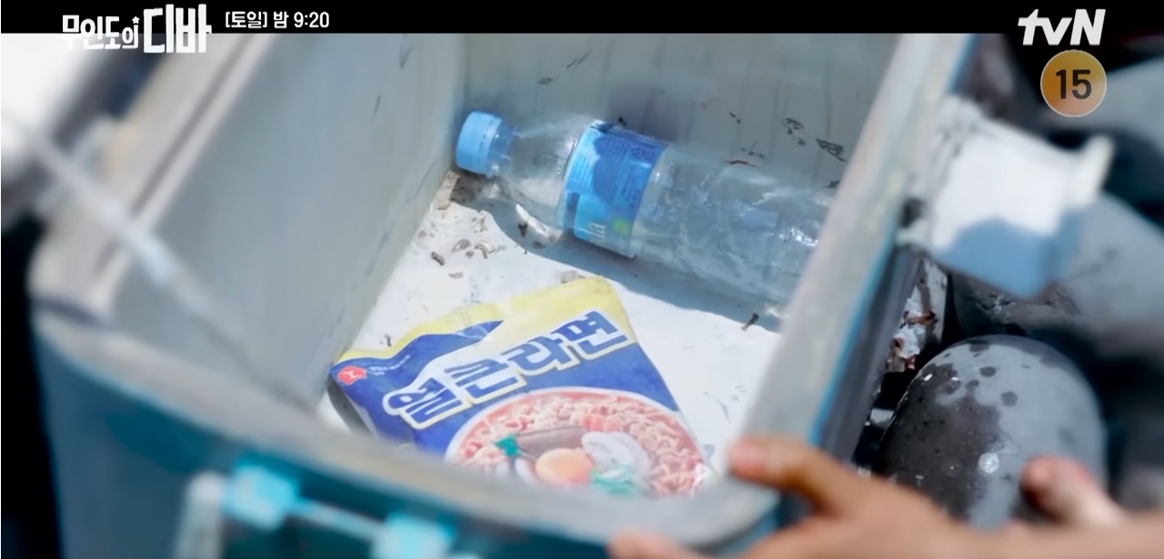 물속에 빠졌다가 아이스박스를 발견했는데 그 안에 유통기한이 아주 많이 지난 라면이 들어있었단다.