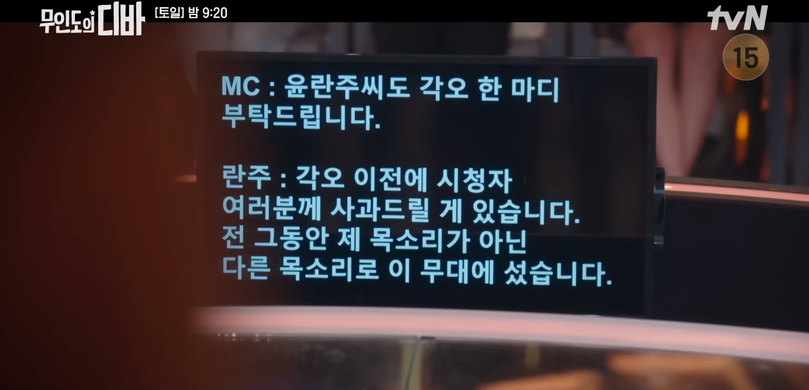 란주와 모래는 무대에 섰다 경연 전 약속대로 자신은 립싱크를 했다고 사과의 말을 하기로 했다.