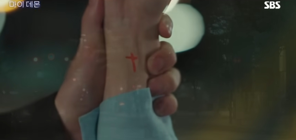 구원은 손목을 좀 줘보라고 하며 십자가표식 손몰을 잡고 질주를 한다.